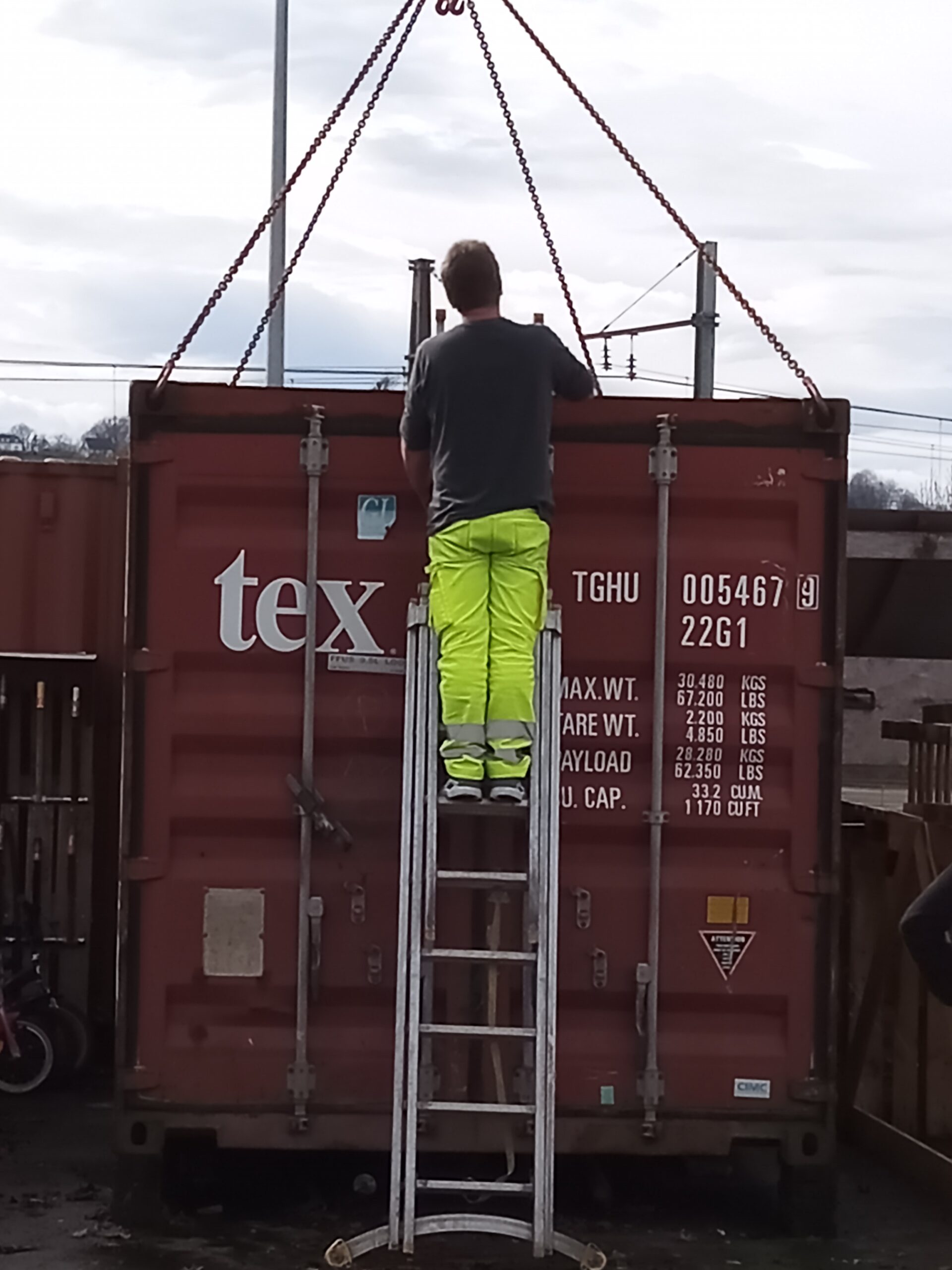 Mercredi dernier, nous avons donc fait appel à un grutier pour déplacer 2 de nos containers de stockage, de façon à ce qu’ils respectent le PLUi – dernière étape avant le démarrage officiel des travaux.